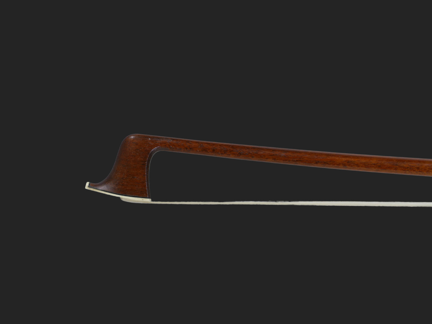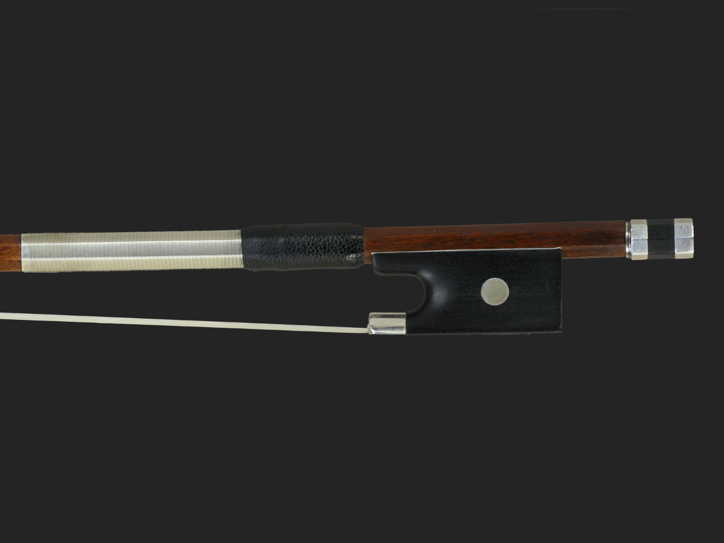 Archet de violon fait par Louis MORIZOT Père, vers 1930. Baguette en pernambouc de section ronde. Hause ébène et argent. Poids 59,1gr. Longueur 744mm. Balance 247mm. Avec certifucat d'authenticité.