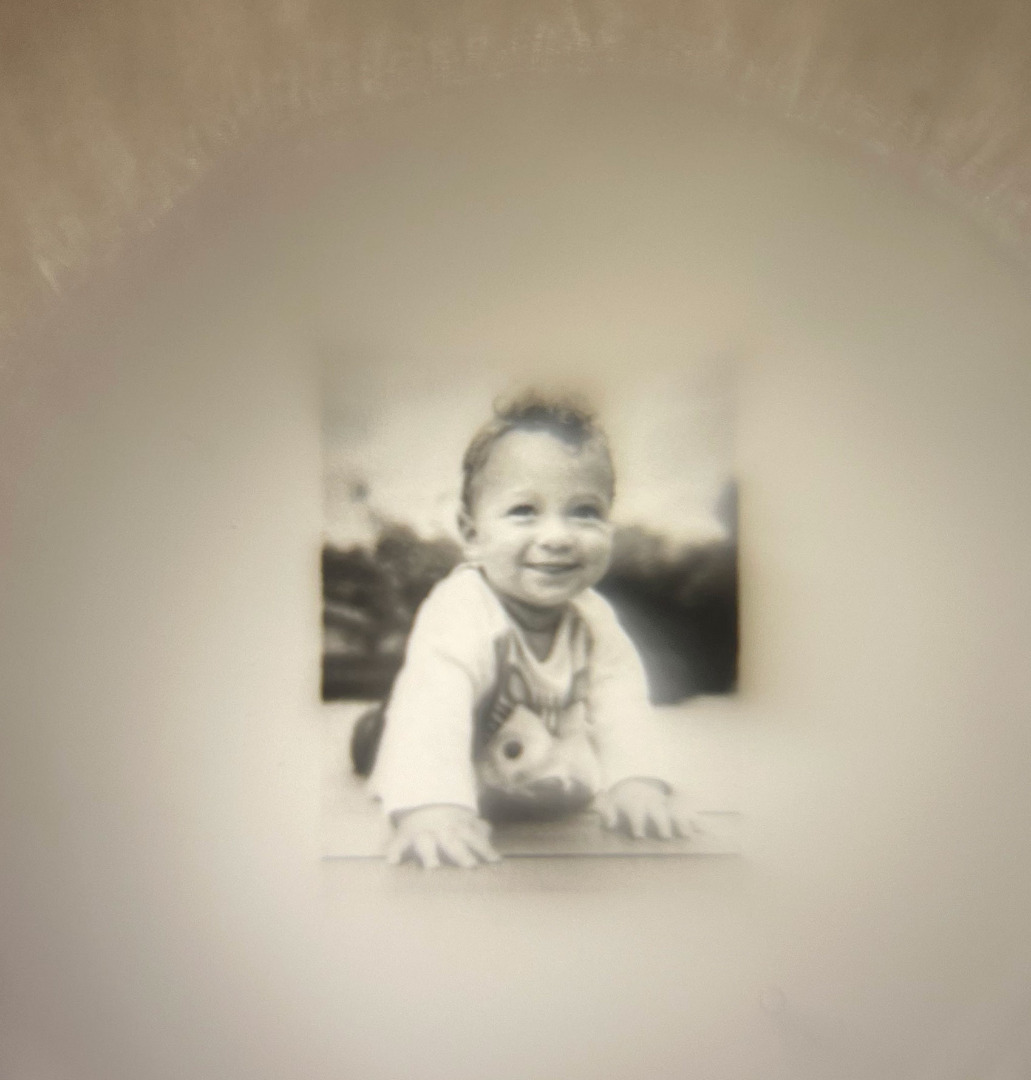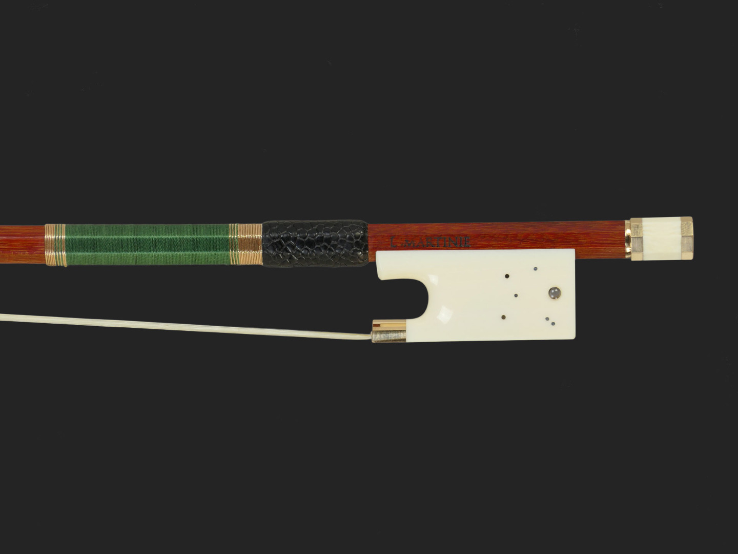Archet d'alto fait par Lucie MARTINIE, à Uzerche, en 2025. Baguette en pernambouc de section ronde. Hausse ivoire et or. Constellation de la Balance en or et argent avec micro photo d'Ulysse.